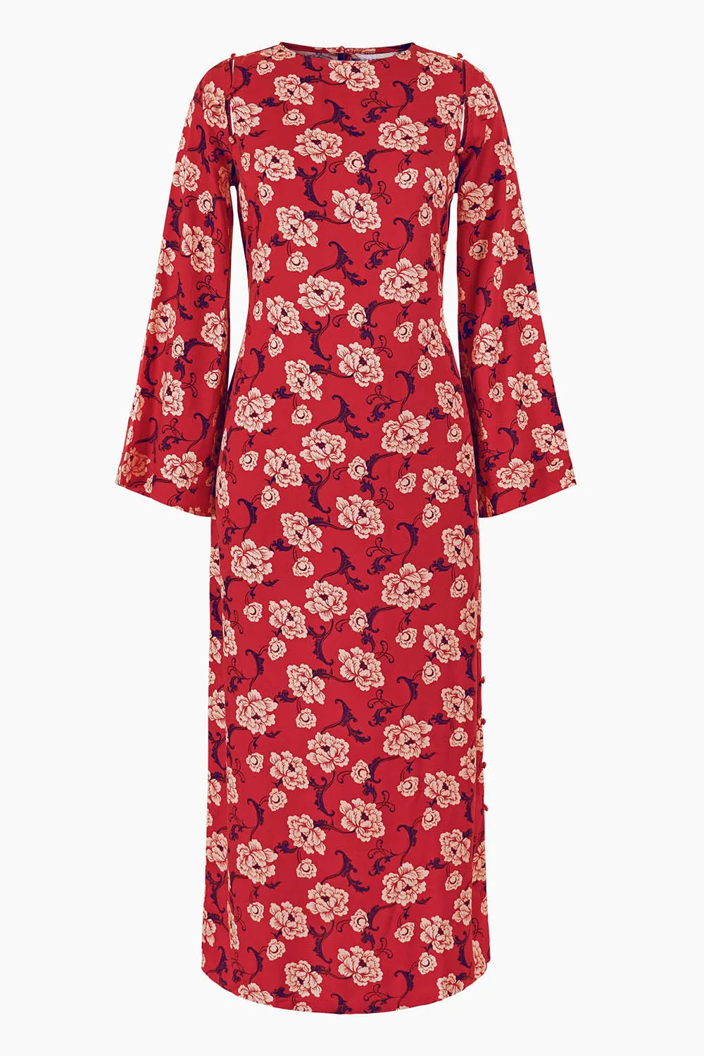 • Floral printed • Removable sleeve • Crew neck • Side slit • Button closure with a keyhole at the back • Long flared sleeve • Tie waist