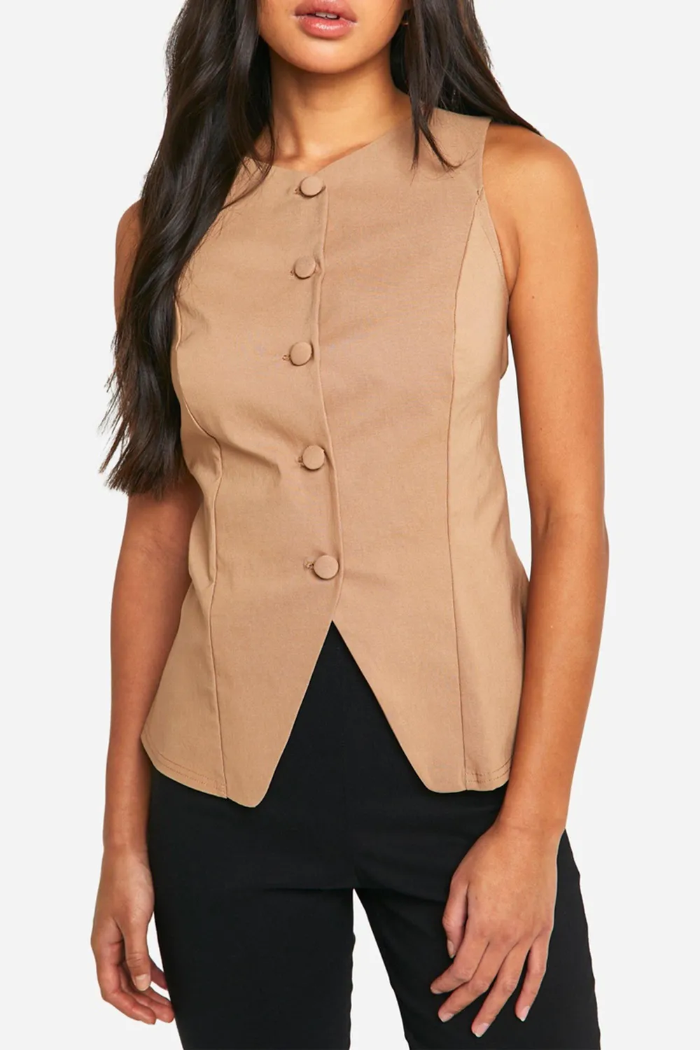 This stylish waistcoat is a must-have addition to your wardrobe, perfect for creating polished looks with ease. The sleek button-front design and fitted silhouette make it an ideal layering piece for various occasions. Style it over a crisp white shirt and tailored trousers for a smart office ensemble, or pair it with a flowy midi skirt for a trendy brunch outfit. The asymmetrical hem adds a contemporary twist, allowing you to experiment with different styling options. For a casual yet put-together look, throw it over a simple tee and your favourite jeans, finishing with trainers or ankle boots. The versatile nature of this waistcoat makes it suitable for family gatherings, casual outings, or even dressed up for evening drinks with friends. Its ability to transition seamlessly from day to night makes it a true wardrobe staple for the fashion-forward woman.